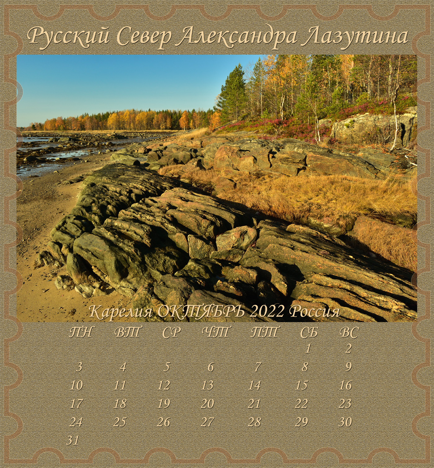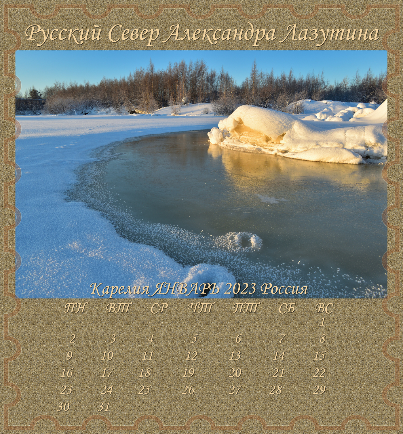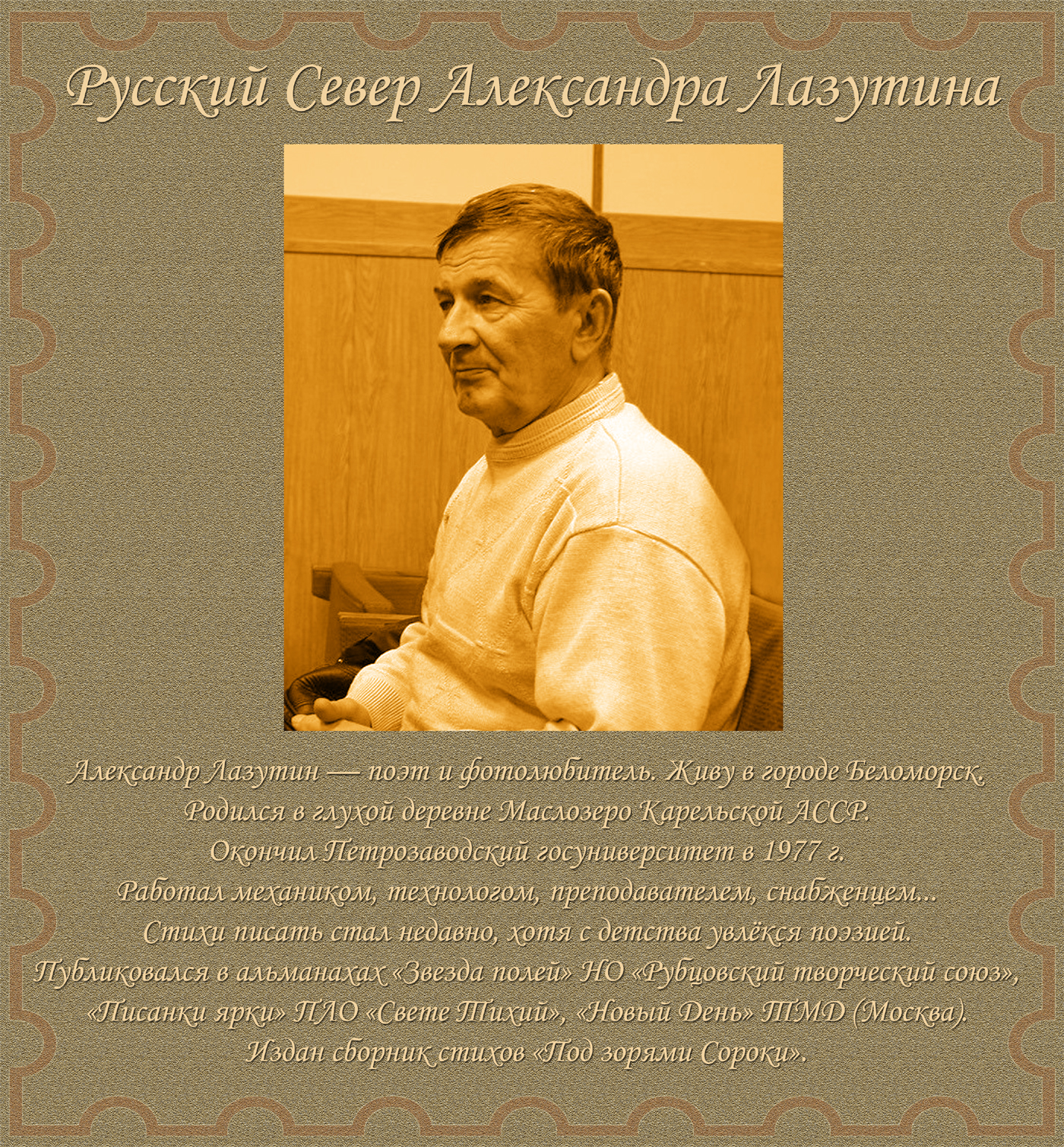В этот Альбом-Календарь вошли фотографии и стихи поэта живущего «у самого Белого моря» Александра Лазутина, постоянного автора нашего журнала. Они расскажут вам о Карелии и Беломорье, о снежных пустынях и седых валунах, о синих озерах и красных закатах над поморьем, о шумящих перекатах, и удивительной красоте и любви этих суровых, на первый взгляд, мест. Нашей северной Фиваиде.