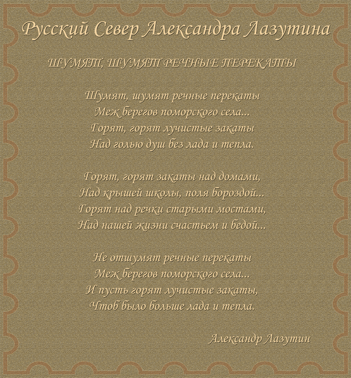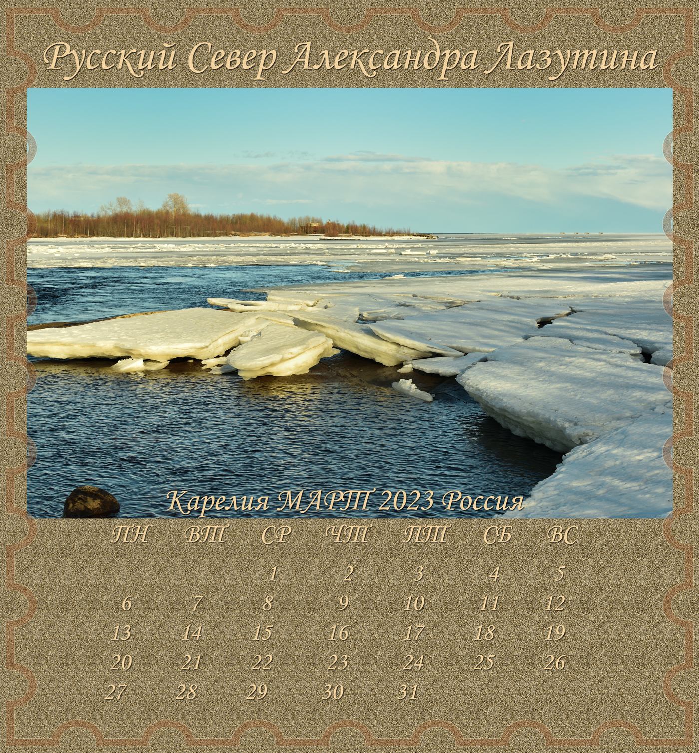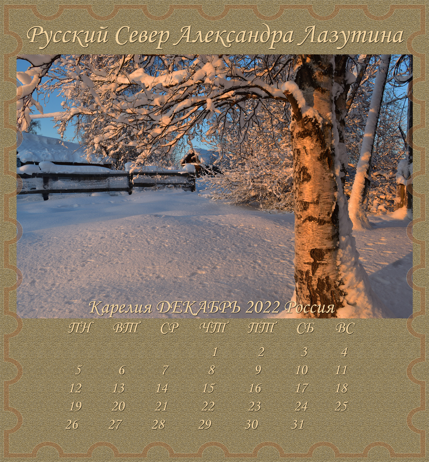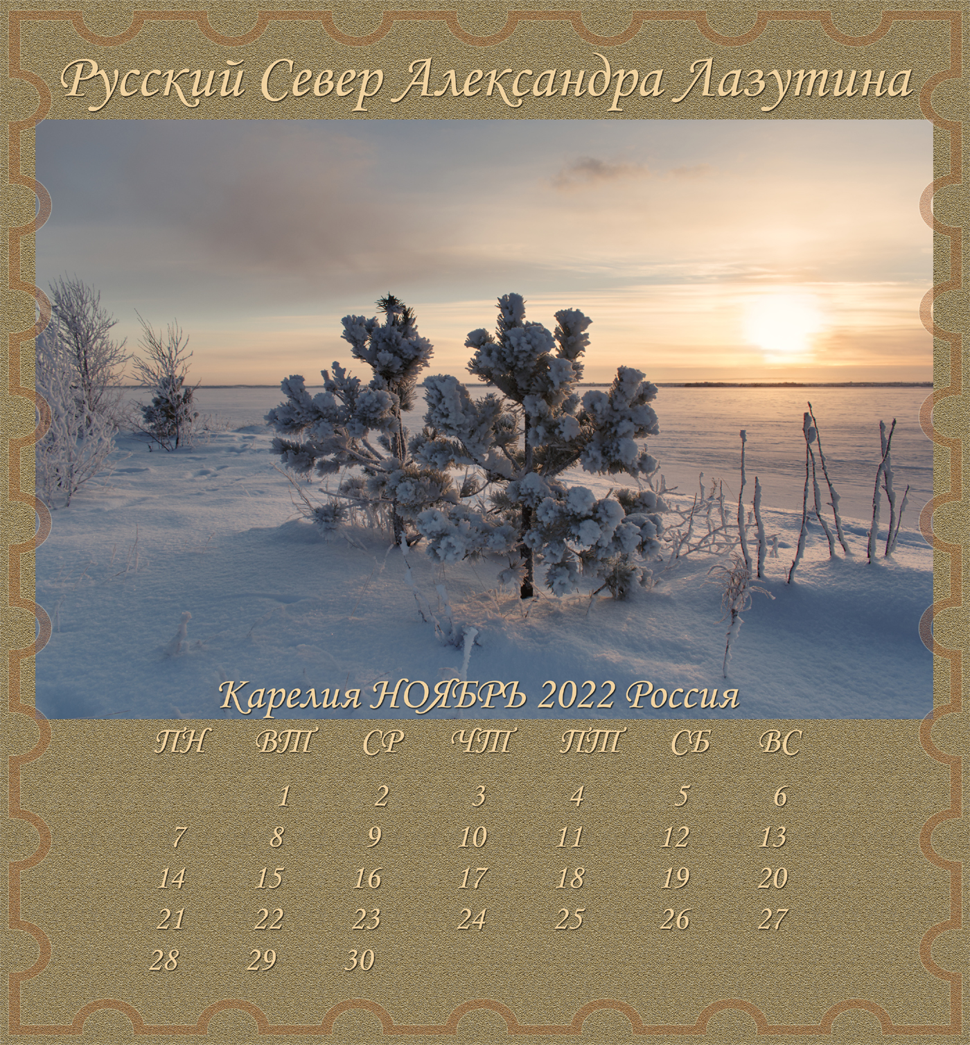 В этот Альбом-Календарь вошли фотографии и стихи поэта живущего «у самого Белого моря» Александра Лазутина, постоянного автора нашего журнала. Они расскажут вам о Карелии и Беломорье, о снежных пустынях и седых валунах, о синих озерах и красных закатах над поморьем, о шумящих перекатах, и удивительной красоте и любви этих суровых, на первый взгляд, мест. Нашей северной Фиваиде.
