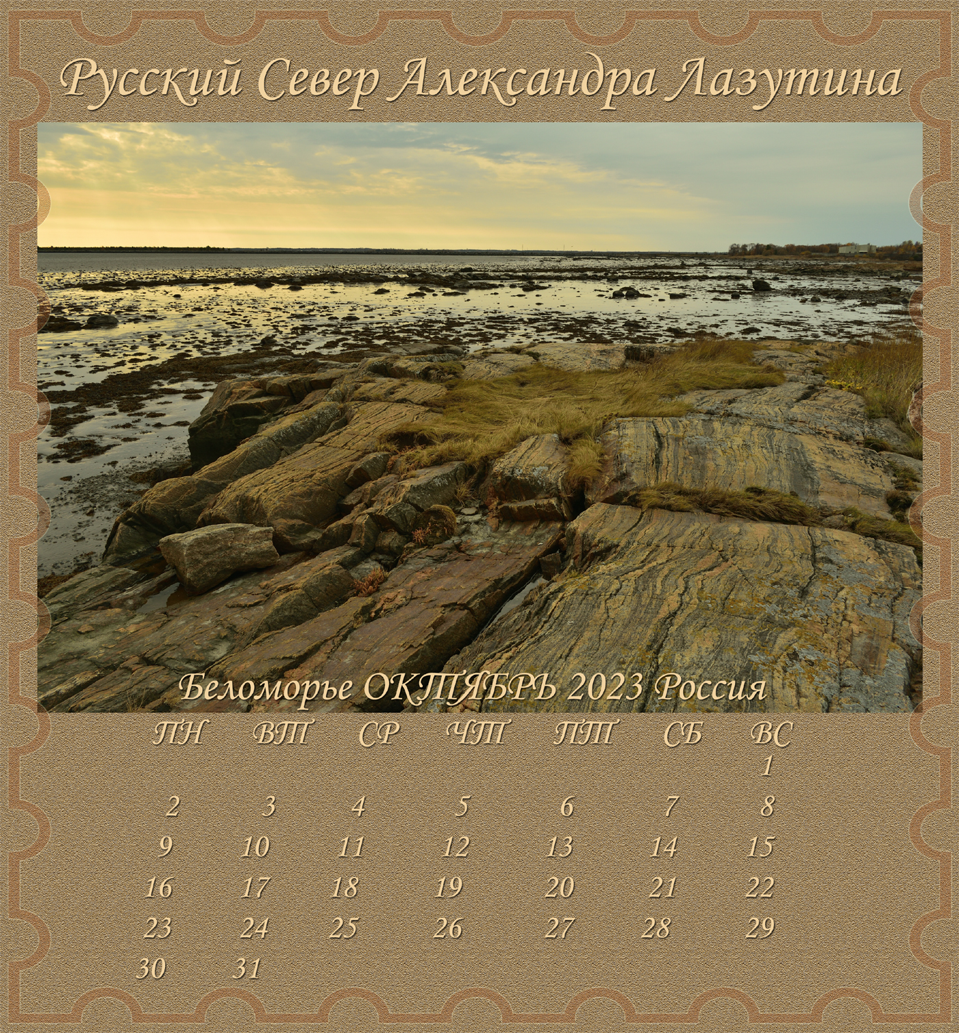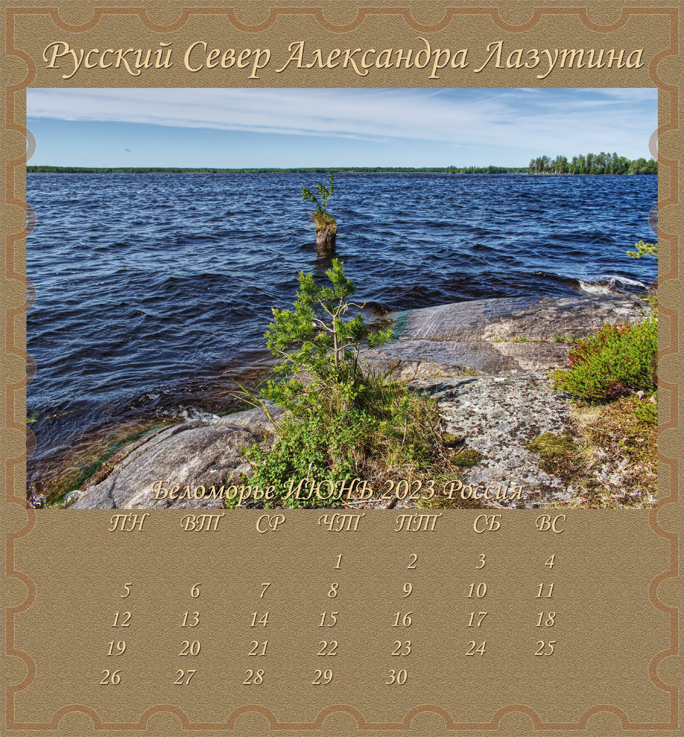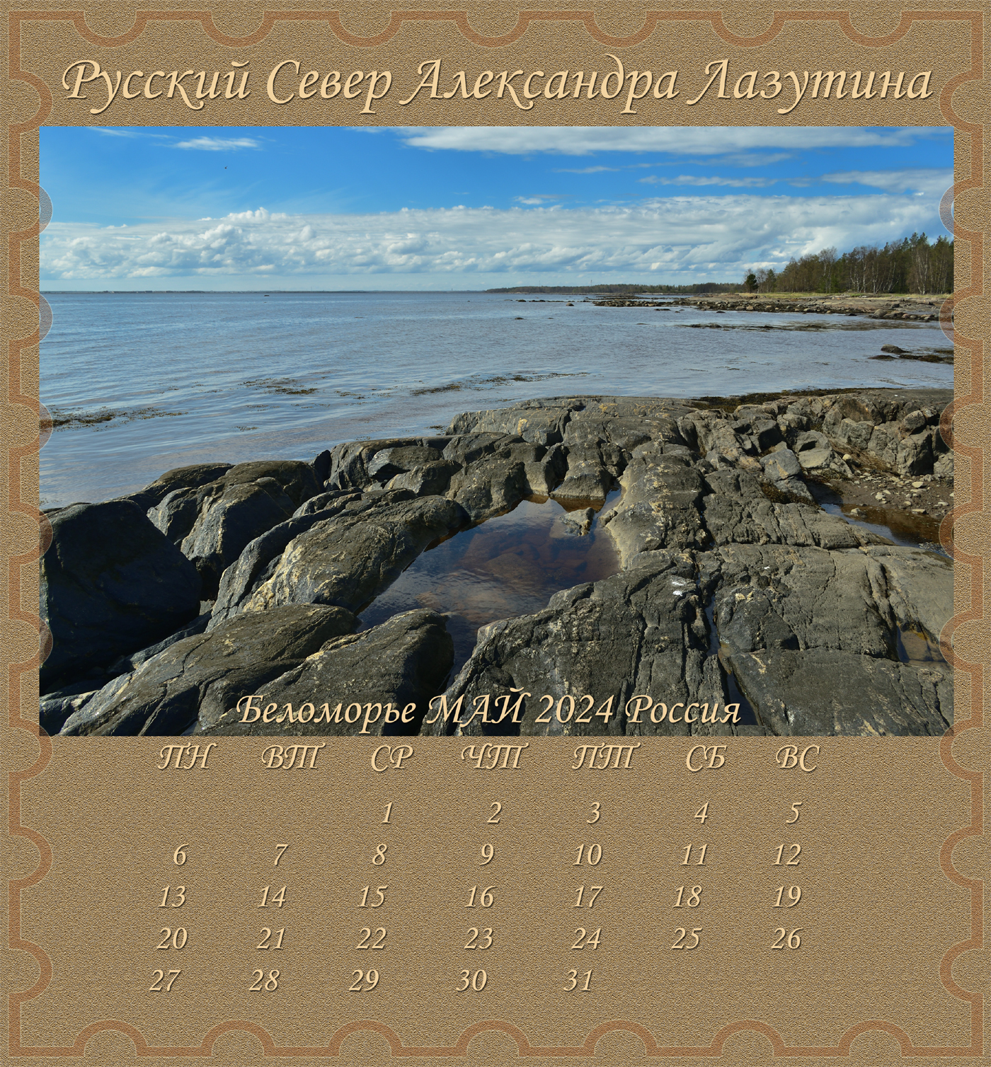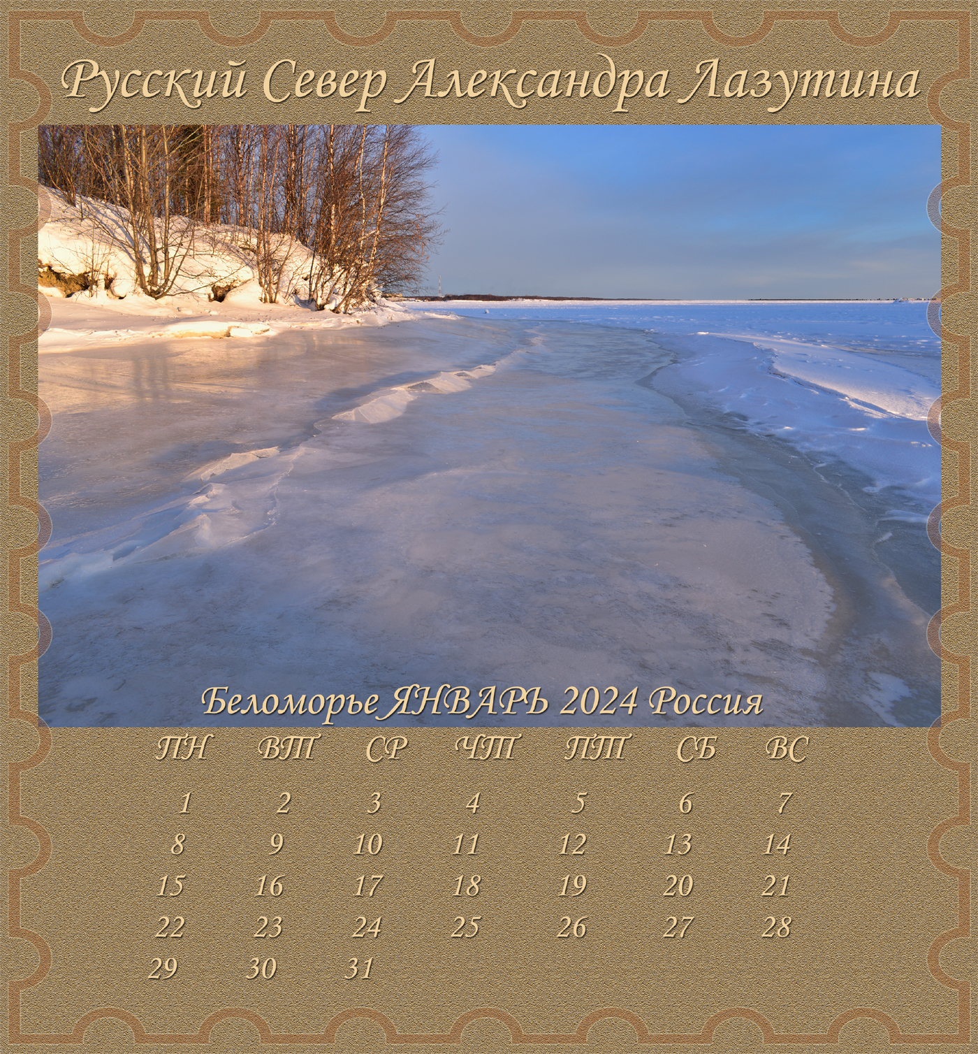 Новый Альбом-Календарь Александра Лазутина, поэта живущего «у самого Белого моря», расскажет вам дальше о Карелии и Беломорье, о снежных пустынях и седых валунах, о синих озерах и красных закатах над поморьем, о шумящих перекатах, удивительной красоте и любви этих суровых мест. Нашей северной Фиваиде. Афоне русского Севера.