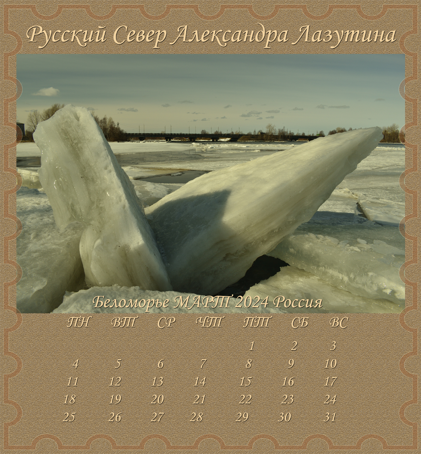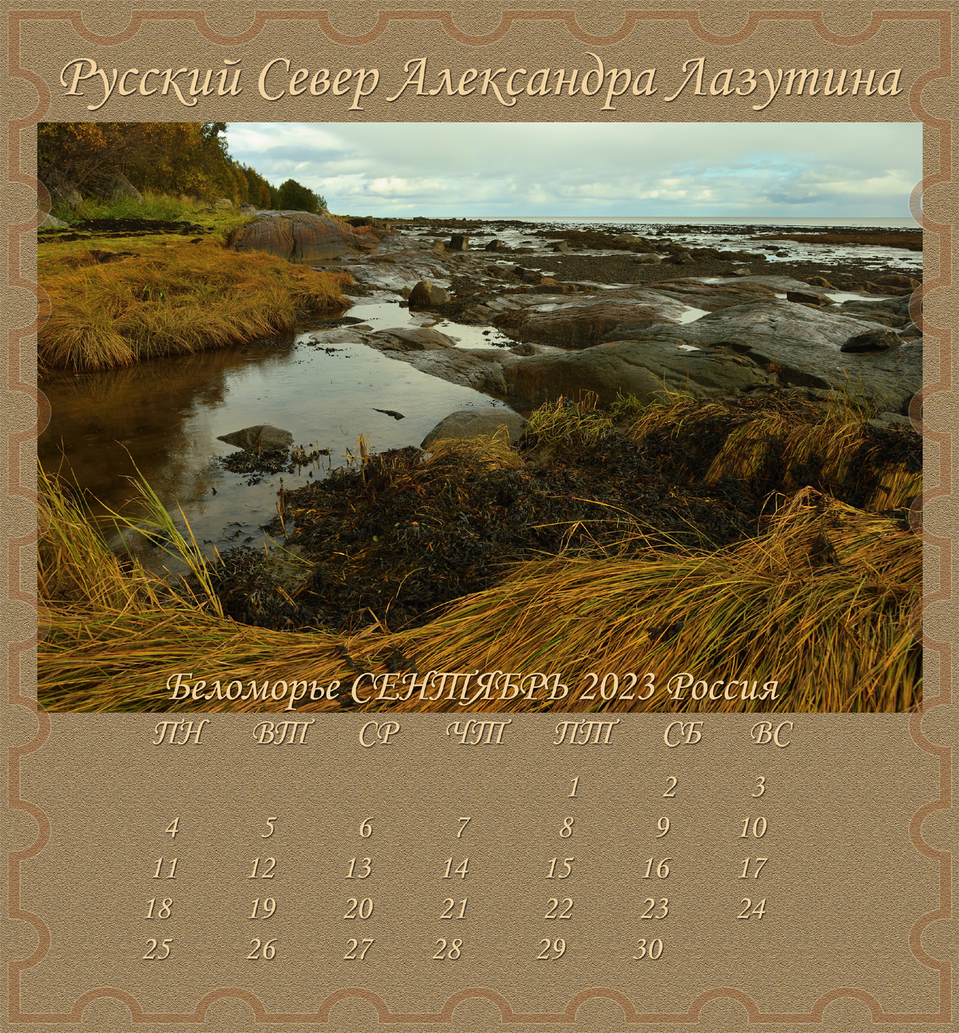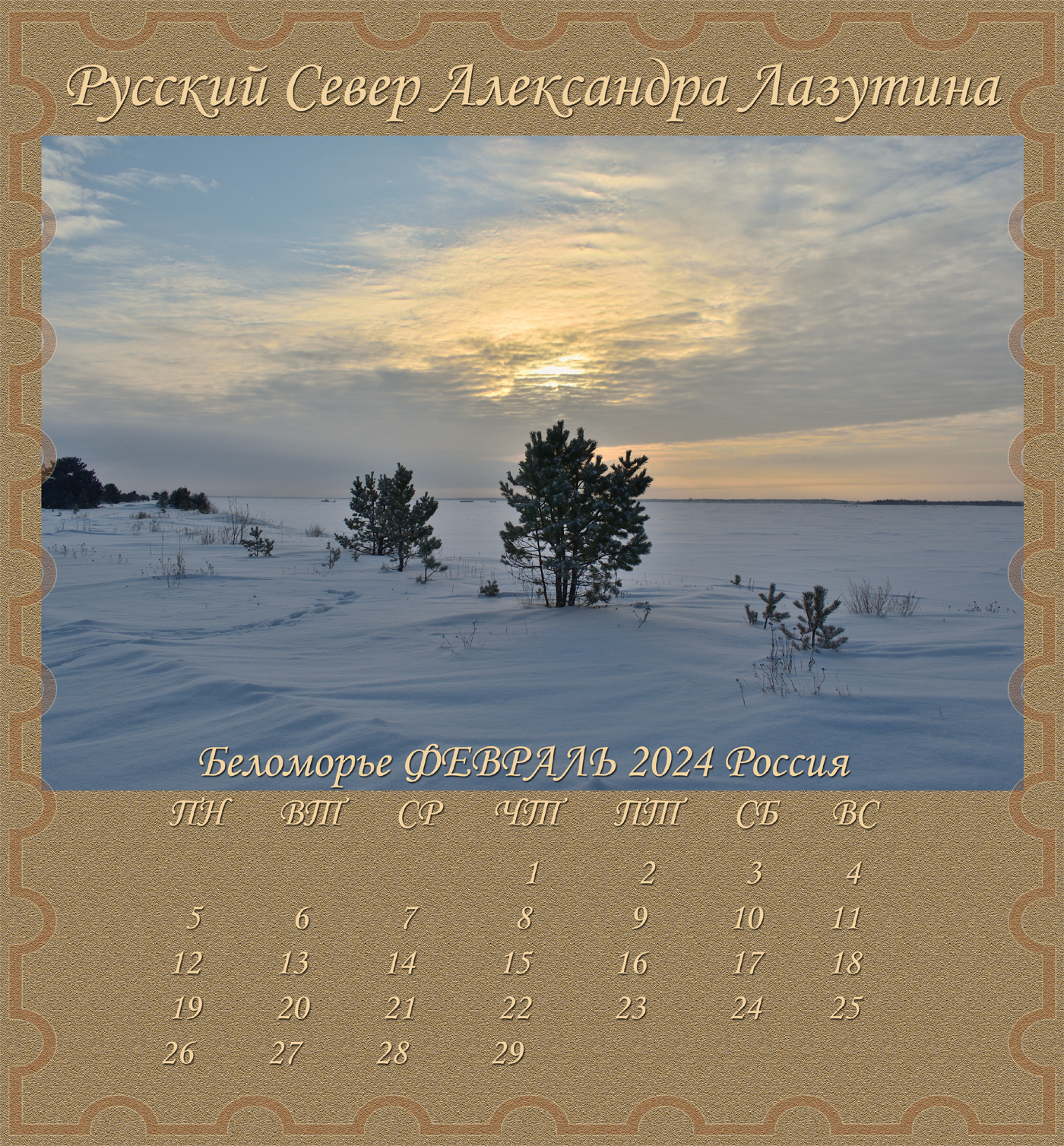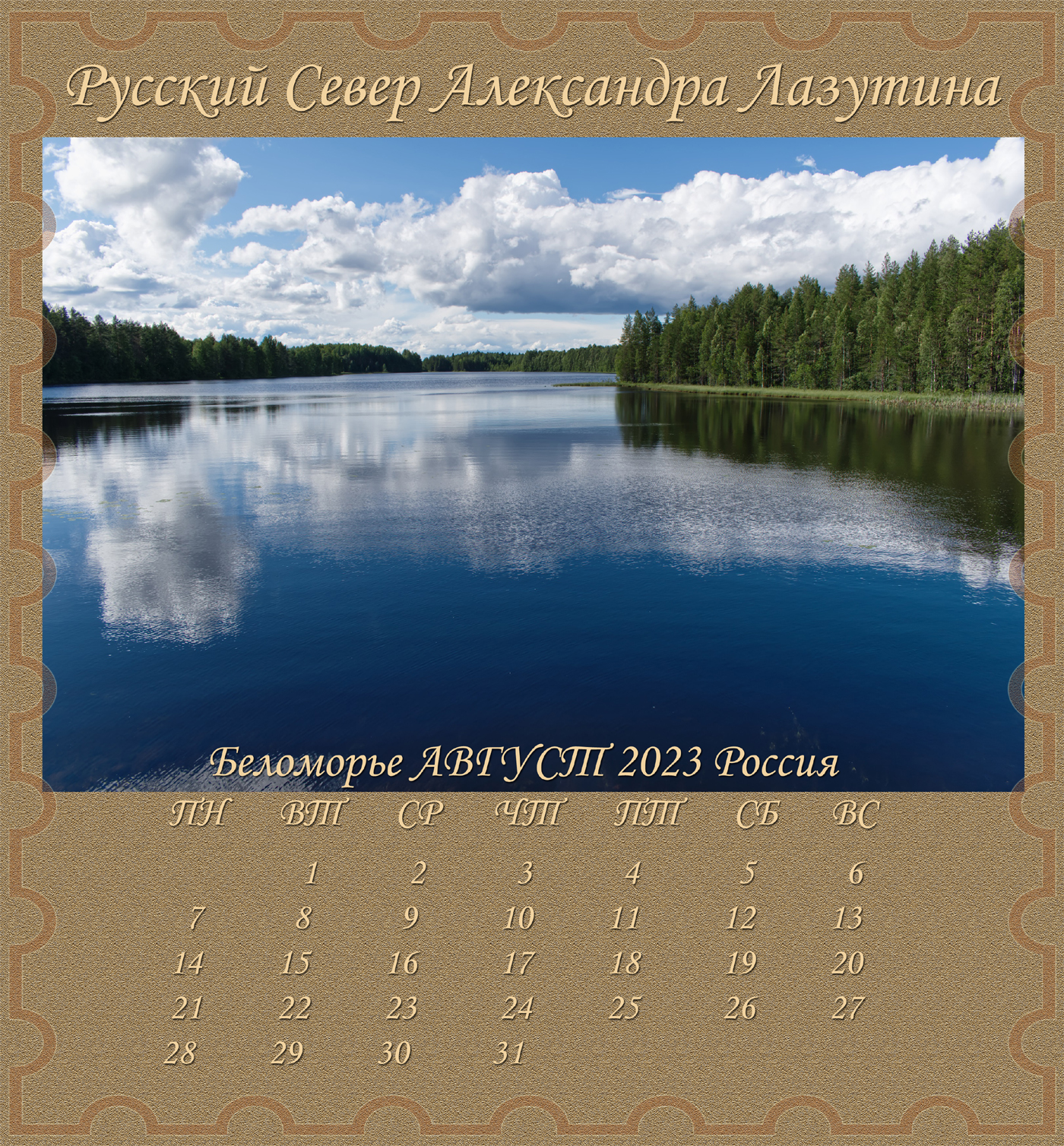 Новый Альбом-Календарь Александра Лазутина, поэта живущего «у самого Белого моря», расскажет вам дальше о Карелии и Беломорье, о снежных пустынях и седых валунах, о синих озерах и красных закатах над поморьем, о шумящих перекатах, удивительной красоте и любви этих суровых мест. Нашей северной Фиваиде. Афоне русского Севера.