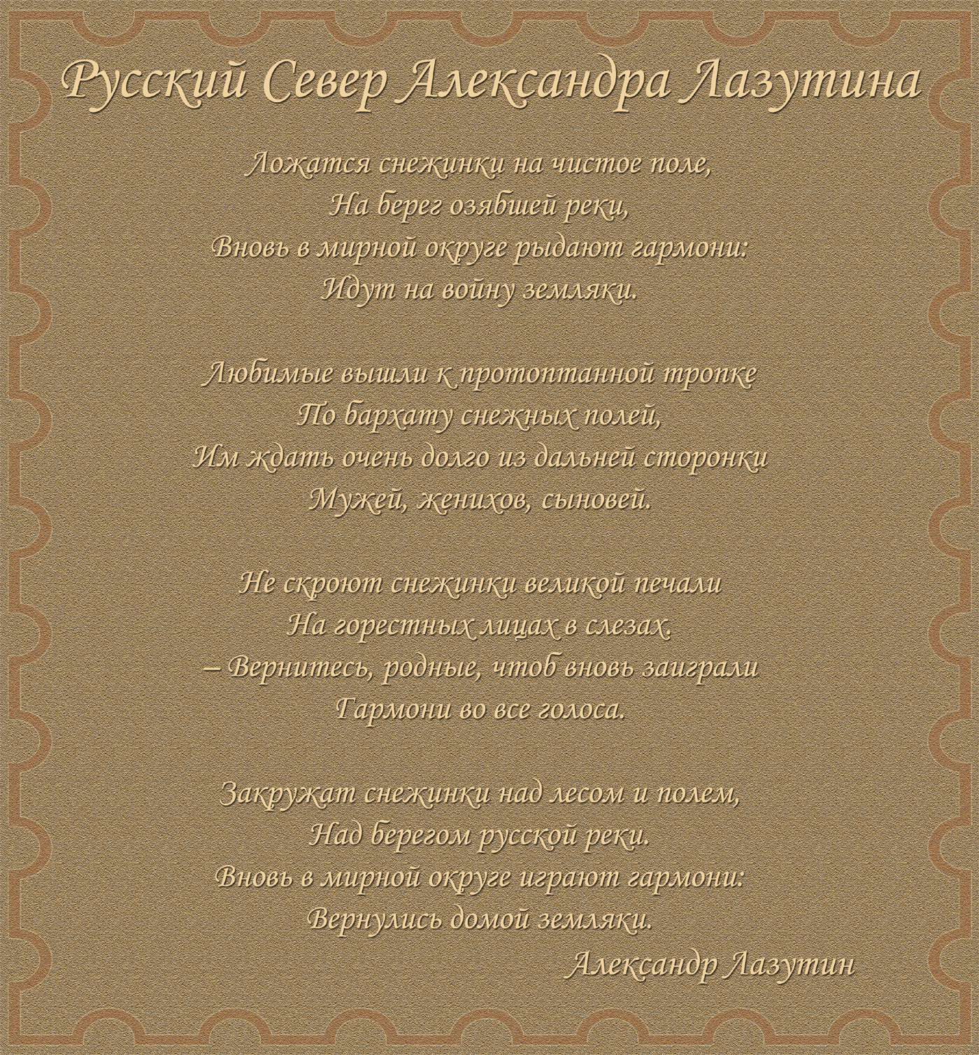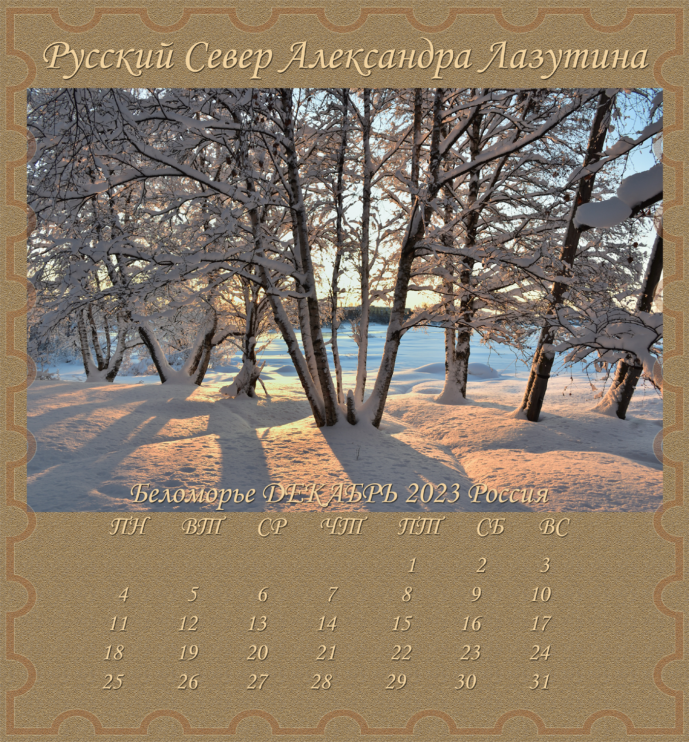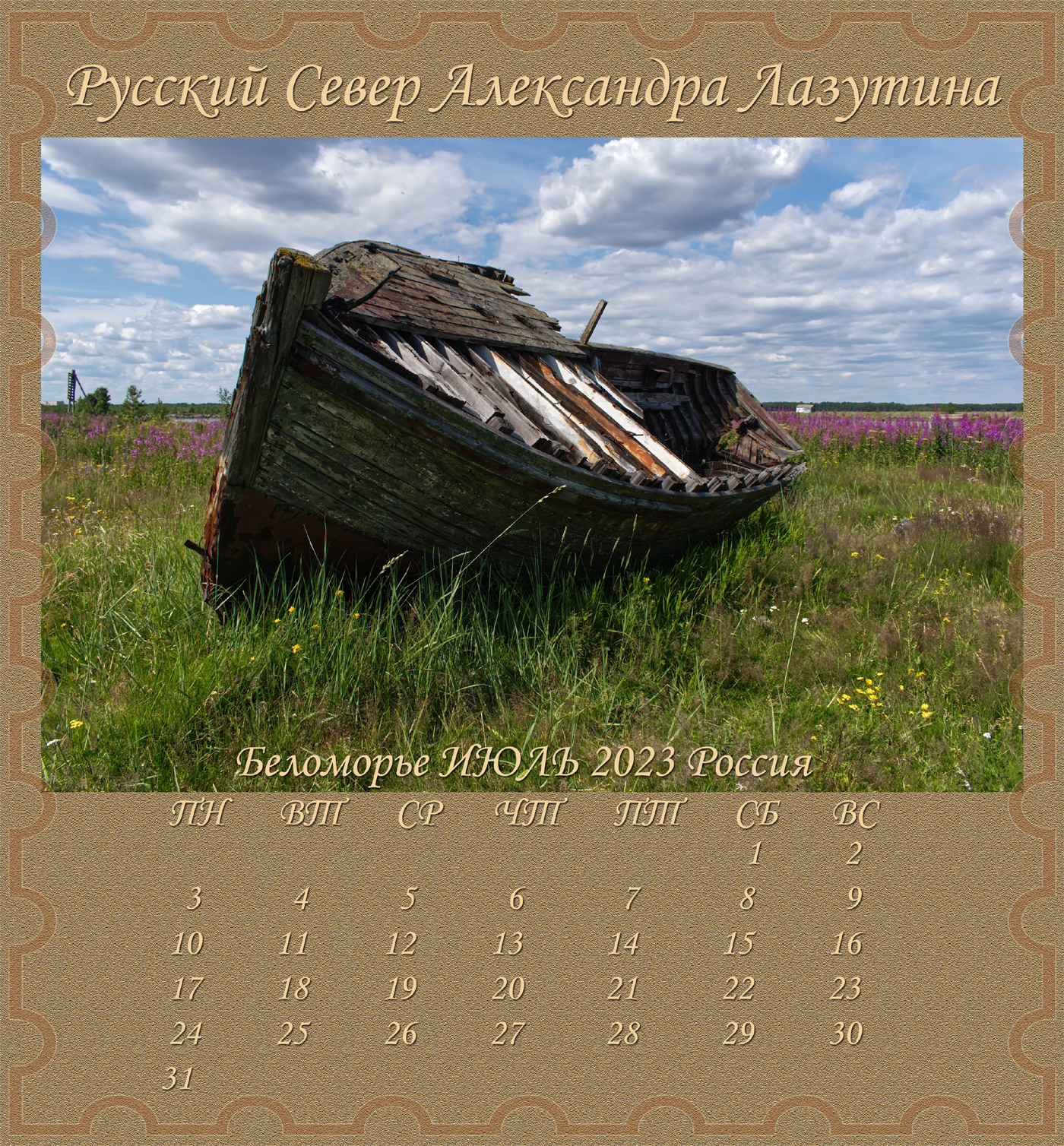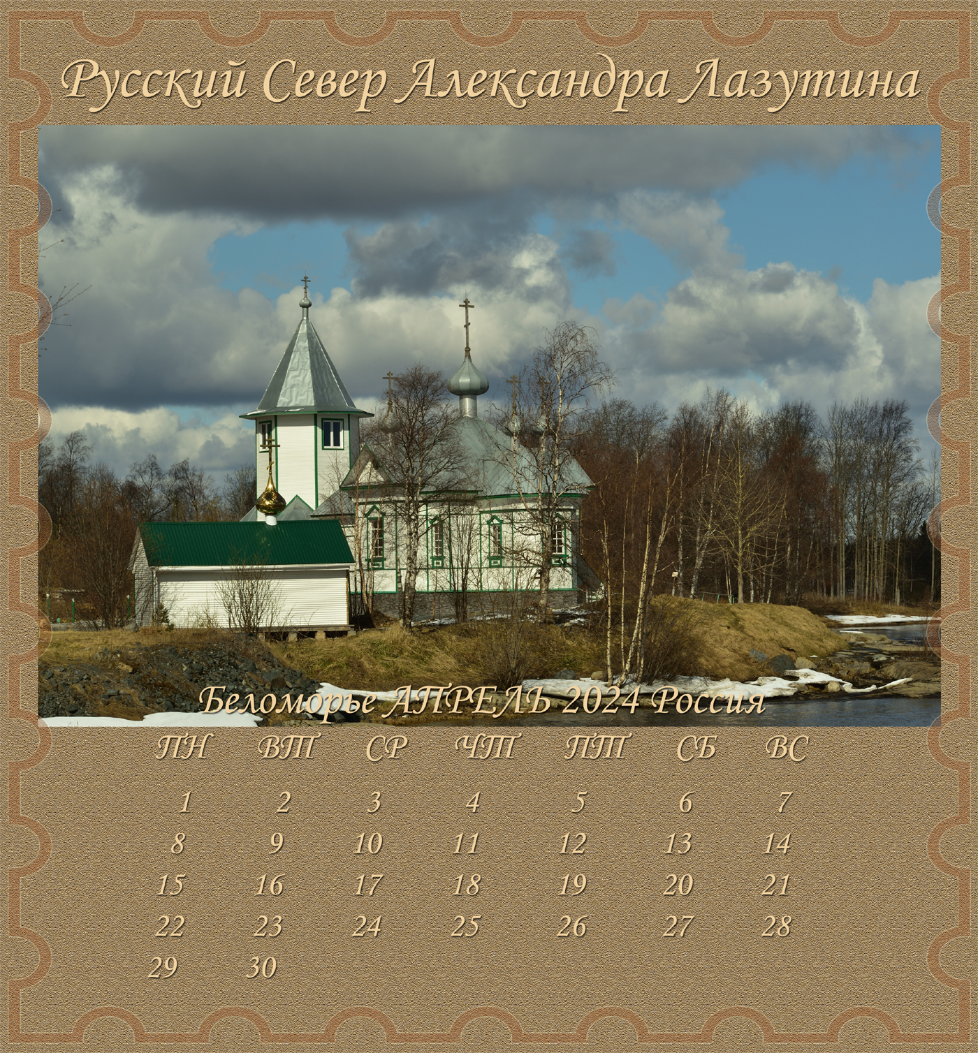 Новый Альбом-Календарь Александра Лазутина, поэта живущего «у самого Белого моря», расскажет вам дальше о Карелии и Беломорье, о снежных пустынях и седых валунах, о синих озерах и красных закатах над поморьем, о шумящих перекатах, удивительной красоте и любви этих суровых мест. Нашей северной Фиваиде. Афоне русского Севера.