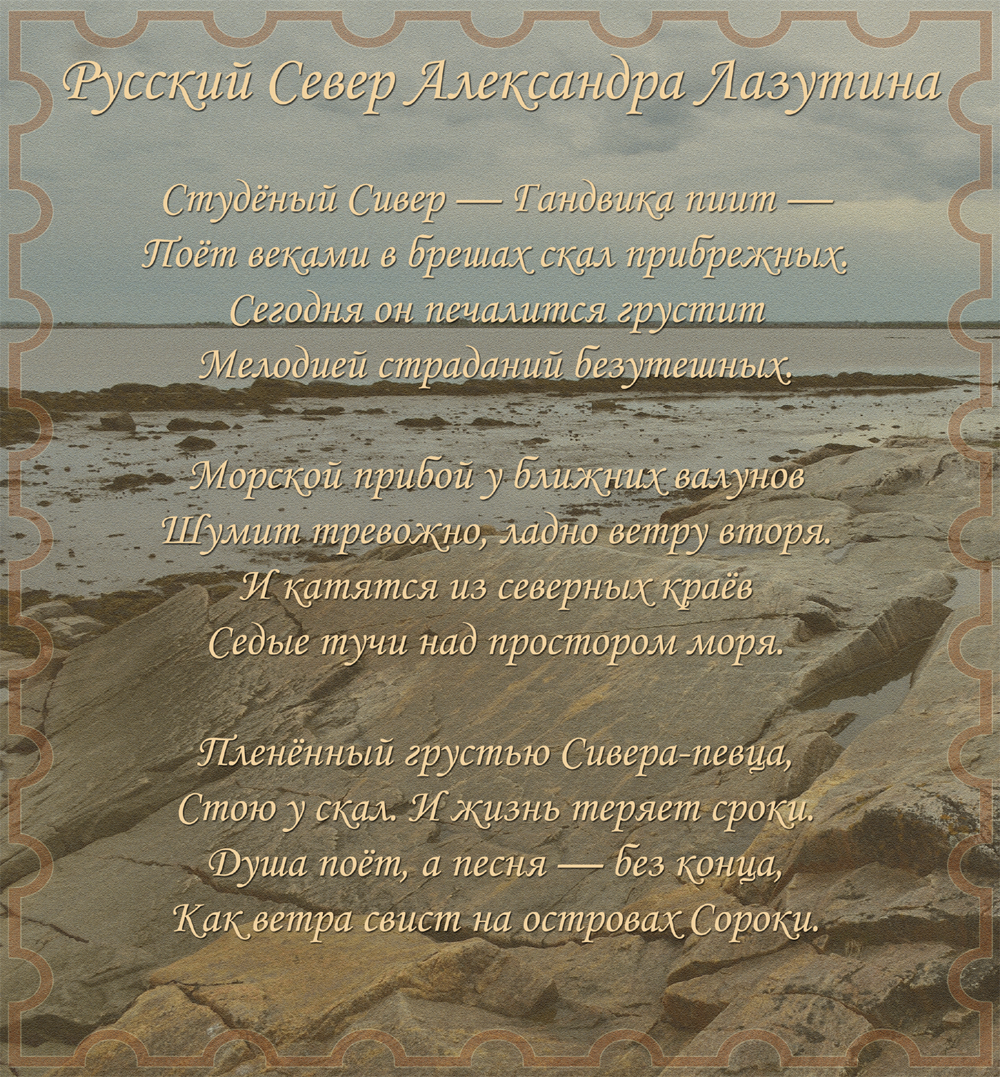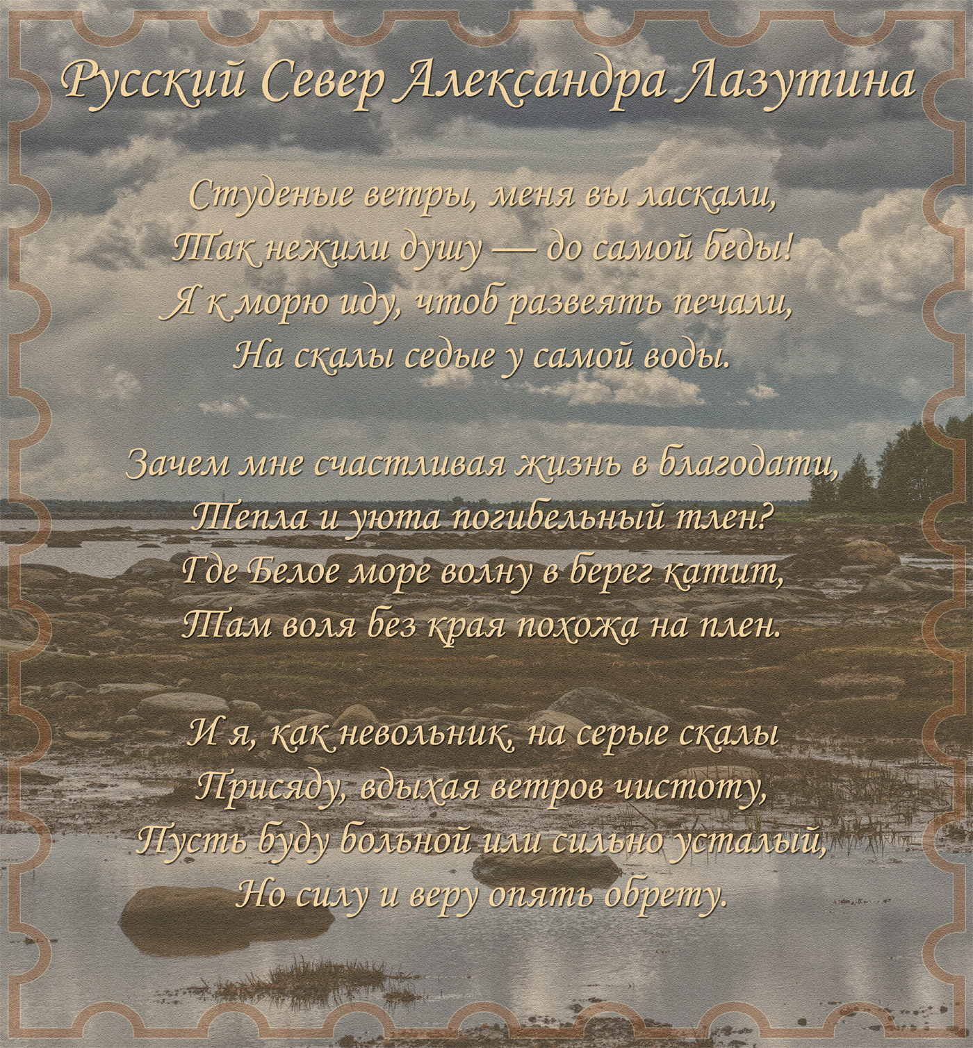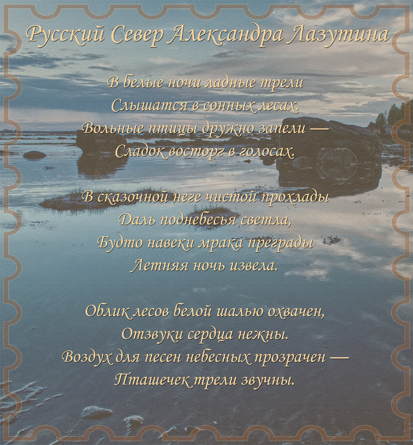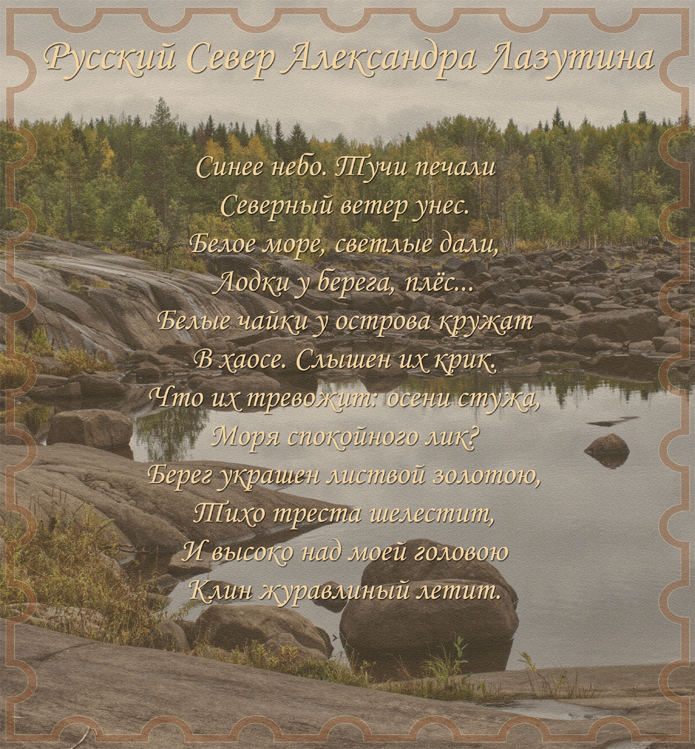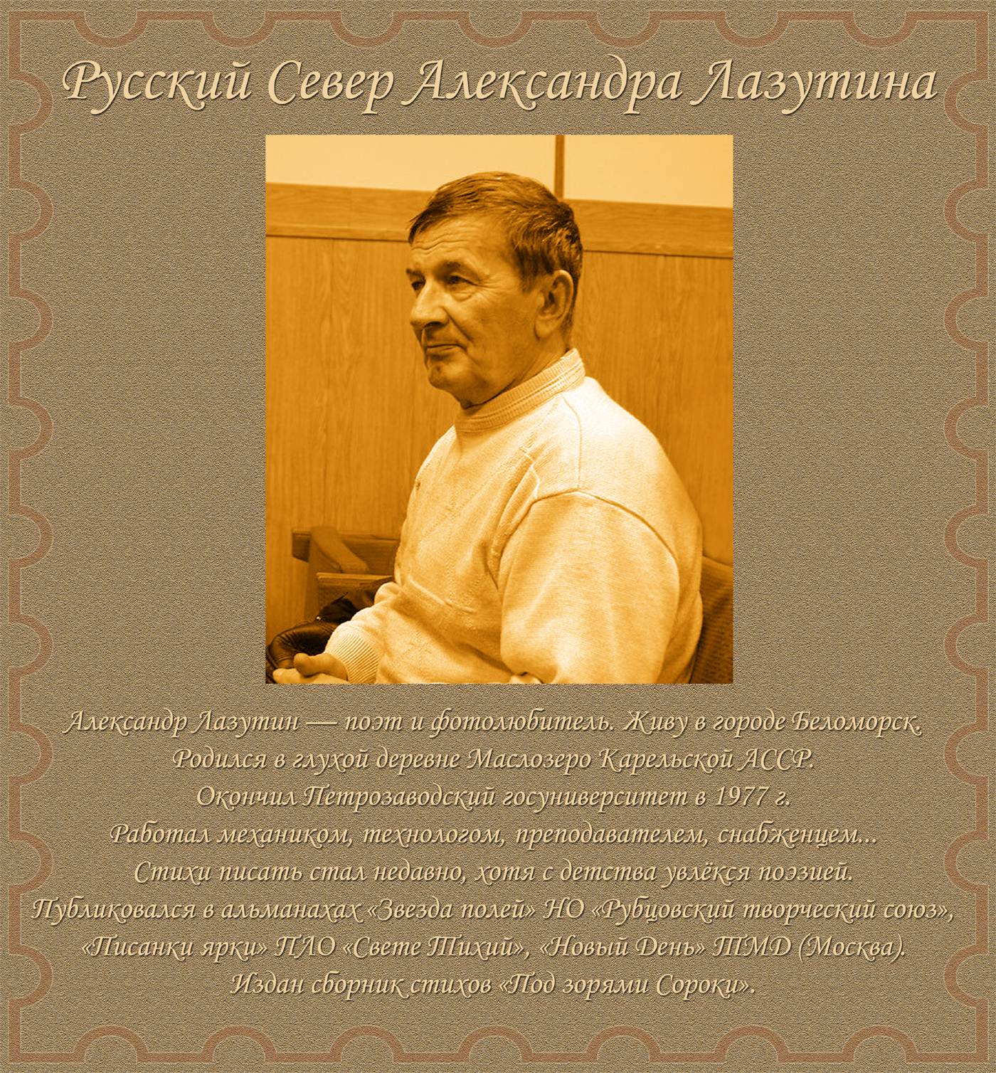 Альбом-Календарь Александра Лазутина, поэта живущего «у самого Белого моря», дополнен теперь еще и стихами. Он расскажет вам дальше о Карелии и Беломорье, об удивительной красоте и любви нашей Северной Фиваиды. Афоне русского Севера.