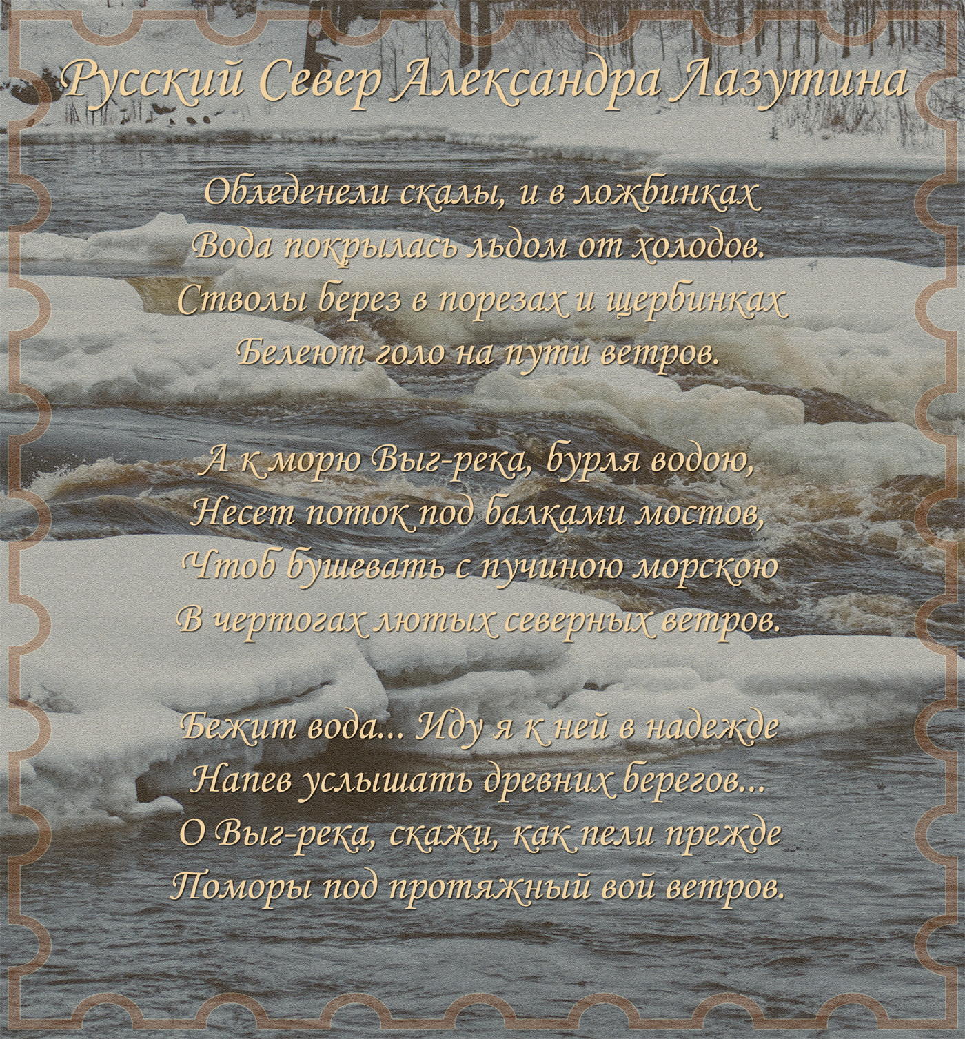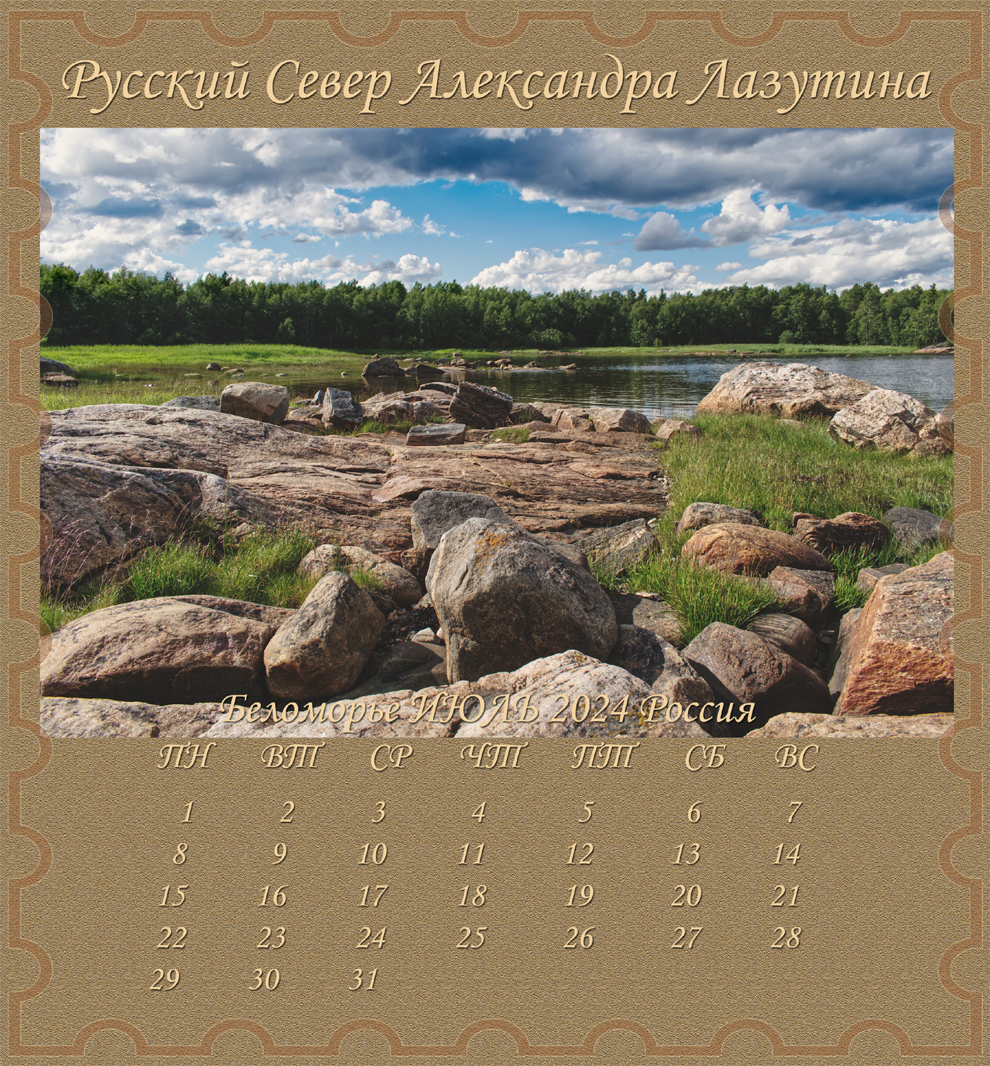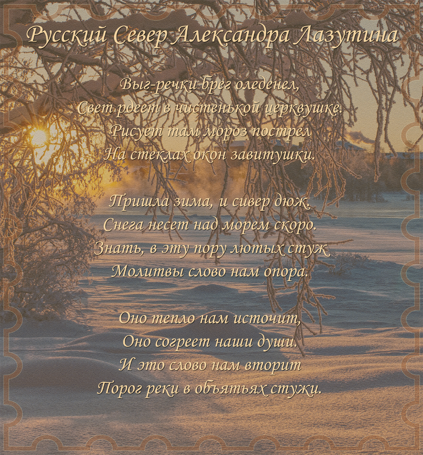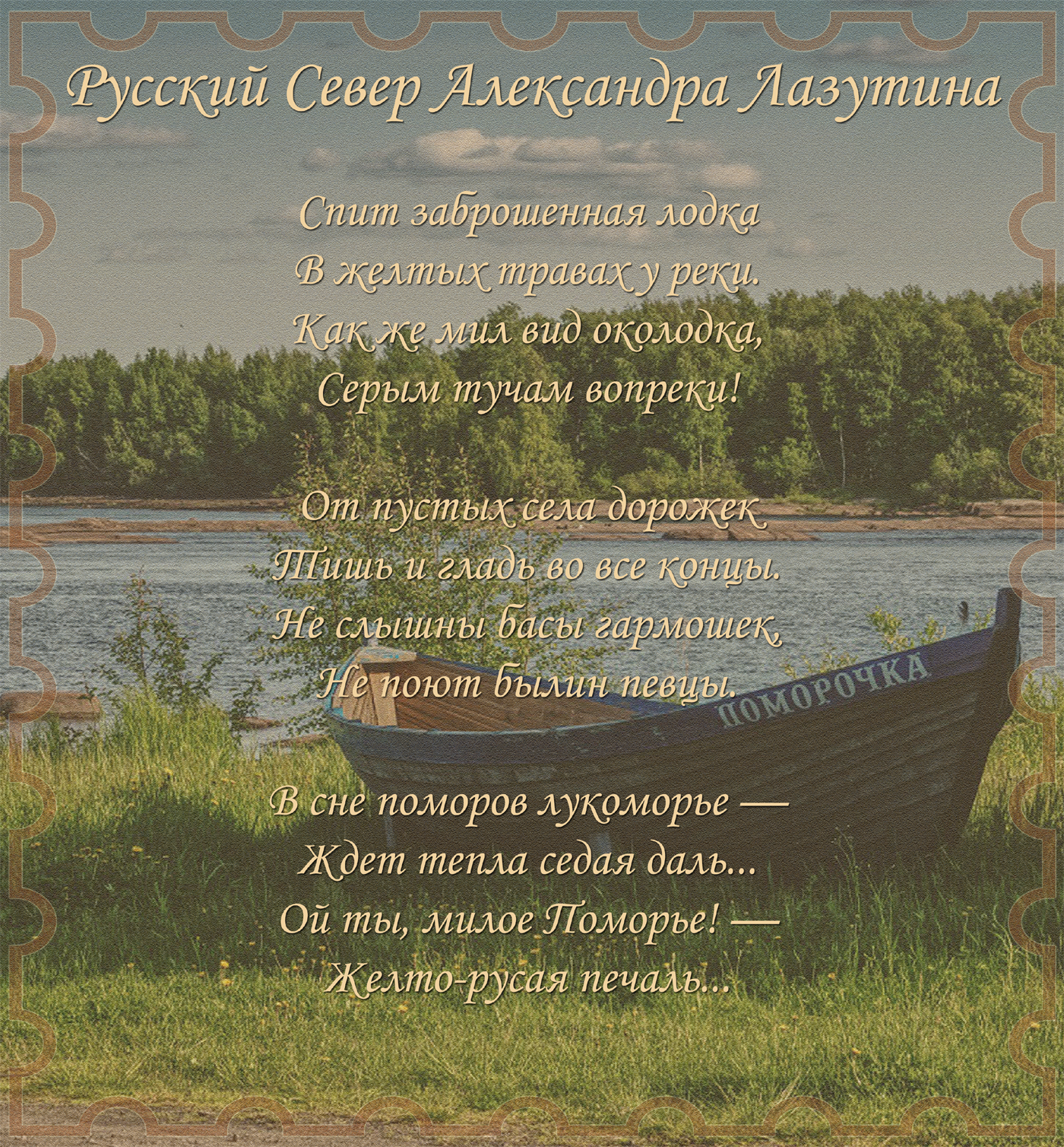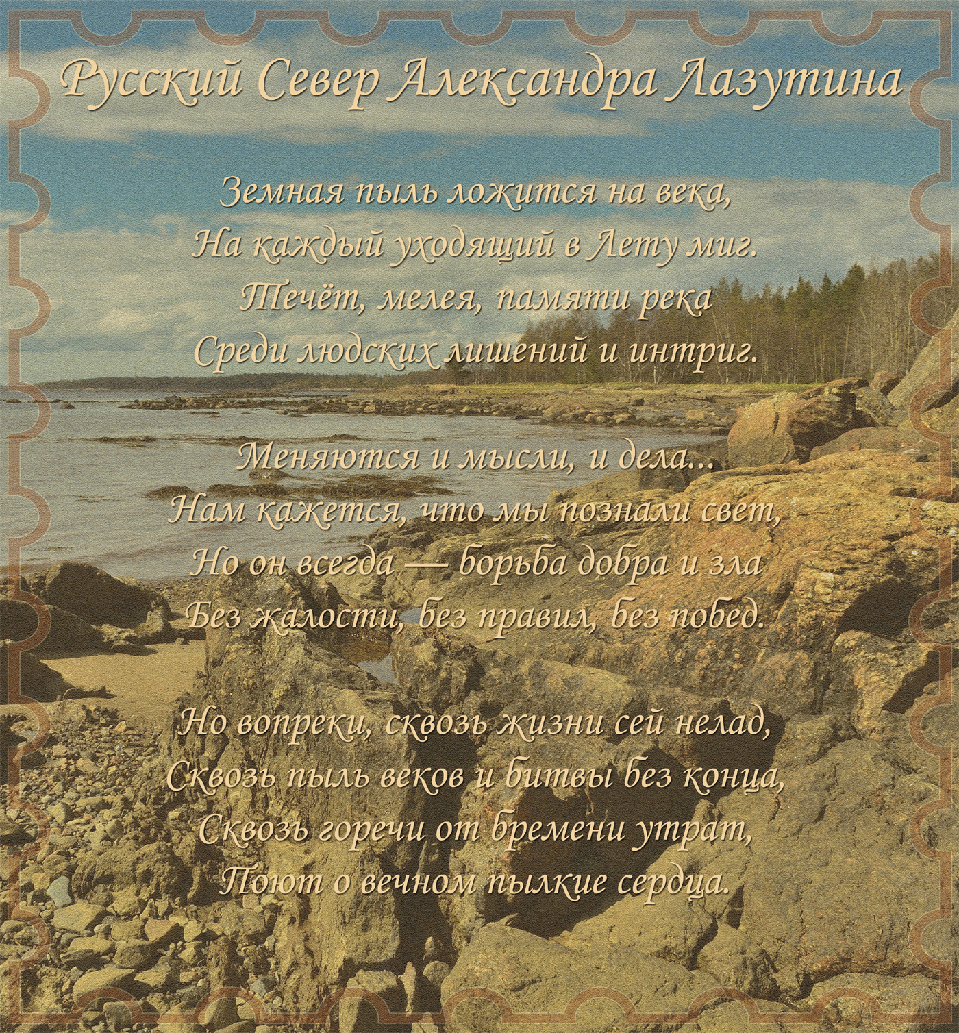 Альбом-Календарь Александра Лазутина, поэта живущего «у самого Белого моря», дополнен теперь еще и стихами. Он расскажет вам дальше о Карелии и Беломорье, об удивительной красоте и любви нашей Северной Фиваиды. Афоне русского Севера.