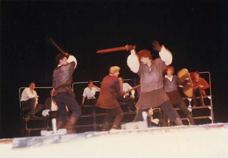 Ефремыч был похож на «горца» из только прошедшего тогда по ТВ фильма – черная бандана, кожаная жилетка, «казаки» со стальными набойками и дорогой мужской одеколон, даже шейный гейновский платочек, кажется был. Вообще почти все «движенцы», с которыми нам посчастливилось в те годы встречаться, совмещали в себе лучшее, что можно было представить юношеским взором в мужчине – доблесть и боевое умение, шик модной, но без вычур, такой кожано-пиратской одежды. Они всегда привносили в любое помещение запах этой кожи, дорогого парфюма, сладкого табака и каких-то странствий просторов по миру и эпохам. Это были такие пришедшие сквозь века, раззолоченные под рясами опричники Грозного, неутомимые корсары Дрейка, русские богатыри с картин Васнецова, прискакавшие только что со своей заставы. Самыми же качествами шикарного «кота» выделялся Богданов, ученик ученика Мейерхольда, преподававший нам биомеханику. Он ходил совершенно неслышно, мягко-упруго, как самый натуральный кот, готовый при том в любой момент отчудить нам в качестве показа такое, от чего даже повидав виды, наши глаза вылезали из орбит. Итак, целый год мы «шагали», рубились и кололи до полного изнеможения и сведения мышц. Оказывается так тяжело просто шагать! А постоять в выпаде минут 10... Какая тяжелая тогда становится в руке шпага! Потом пришли мечи. Настоящий вес – три кило не меньше, но мягкая сталь, чтоб не было сколов в глаза и т.д. (шпага после месяца работы с мечами – кажется спичкой в руке – веса не ощущаешь совсем) Когда стали готовить отрывки к экзамену, конечно, не обошлось без Шекспировского «Макбета». Где еще можно так подраться на тяжелых мечах, как ни там? Из Гитисовских закромов были извлечены два деревянных щита (впоследствии обитые нами железом и тканью – и для вида, а главное, чтоб остаться и до следующих курсов «в живых», интересно живы ли они еще – делали на совесть). И сцена произошла такая. Алексей с Александром начали показывать бой Макдуффа с Макбетом. Ефремыч с трудом усиживал на своем стуле, видя все это действо – им разумеется поставленное и отправленное на самостоятельную «отточку» – потом перешел в негромкое рычание и не выдержав, наконец, увиденного, с криком: «Что ты его гладишь!» – выскочил сам. Выскочил из века 20 сразу в 9ый. Выхватив меч у Алексея, он так стал атаковать бедного Александра-Макдуффа, что тот только, что и успевал закрываться своим щитом. Грохот стоял древнегреческий, земля тряслась, со щита летели в разные стороны щепы, Александр тщетно пытался подавать сигналы SOS, но при этом, это все – было абсолютно безопасное сценическое фехтование. Удар, пущенный во весь размах, шел только в объект – щит или меч – не ставя задачу пробить дальше – как в боевом случае – и главное условие было вовремя остановить руку – с какой бы скоростью и силой она не летела бы по голове партнера, она сама останавливалась, даже если противник не успевал выставить заслон.