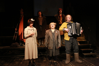 Периодически на сцене появляются и участвуют в общих номерах три вот таких персонажа (Алексей Сидоров, тот же Дмитрий Богдан и Александр Орав): тоже в полубродяжьих тряпках, но в то же время как бы в одежках буддийских монахов. Если в существовании всех прочих есть некий оттенок язвительности и пародийности, то эти трое куда как серьезны. Они, вот такие, вроде узнаваемые, но всегда непонятно кто и откуда, - всегда, во все времена, во всех землях, во всех преданиях ходят по трое. Волхвы, идущие за Вифлеемской звездой; калики перехожие; верховное существо и два его спутника – неузнанные, но творящие чудеса. Просто предупреждающие о грядущих потрясениях. Или только одним своим появлением намекающие на нечто такое…