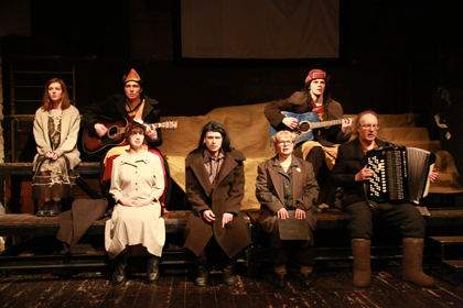 Но Погребничко, сочинитель и постановщик спектакля, играя также и на этих ассоциациях, как на знакомых и легко отзывающихся струнах, все же строит историю не об этом. Не о буквальной памяти о прошлом. Но о гораздо более масштабных и глубинных вещах. Да, и музыкант, и певица, и «конферансье, и девушка «капитана» (Мария Погребничко), и прочие одеты в какое-то отрепье. В невообразимую смесь частей из самых несочетаемых нарядов. Так выглядели не только «доходяги», но и многие ссыльно-поселенные, и многие «вольняшки». Да и большинство народу в первые (да нередко даже и в последующие) послевоенные десятилетия выглядело так же: отстраивались, залечивали раны и потрясения, среди бараков, халуп и развалин возводили новостройки, освобождались от ужасов войны, заново знакомились, оживали, женились, рожали… а ходили кто в чем! Перешивая латанное-перелатанное. У кого что было.