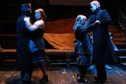 Впрочем, и все персонажи здесь таковы. «Бывший капитан» - так обозначен персонаж Дмитрия Богдана в программке: ушанка, шинель, сапоги. Иногда изображает странный танец – будто птица кружится на месте, пытаясь взлететь. Или… рыба: Вот, по-рыбьи открывает-закрывает рот, пучит глаза, виляет «хвостом» и «плавниками». К нему порой так и обращаются: рыба. Может, это полоумная дама таскает с собой рыбку в аквариуме? Или это «бывший человек», ныне – «без ума» от передряг и испытаний, доходяга… Где вообще все это происходит? В лагерном или тюремном клубе, где заключенные и охранники сами себя развлекают в разрешенные часы досуга? Или на пересылке? Или на пристани (на станции), в ожидании парохода (поезда), который увезет отмотавших срок (реабилитированных) из Магадана-магады «на материк», в их родные края? Тем из зрителей, кто весьма взрослый, поживший, старших возрастов, память услужливо подсказывает все эти ассоциации.
