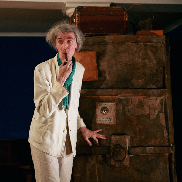 В «Старухе Хармс», имея таких же тонких и чутких партнеров, как Татьяна Буряшина и особенно Никита Логинов, Андрей Кочетков не просто некто Чинарь. Сценическая ипостась актера Кочеткова здесь – некая сущность, исследующая другие сущности. Их пребывание в этой мирской суете, их взаимоотношения с надмирностью и друг с другом. Неспешно, без пафоса и надрыва, в плавном, медленном ритме, почти без изменения внешнего облика, переходя из личины одного персонажа в личину другого и обратно, Андрей перемещается вроде бы, визуально, в пространстве сцены, на самом деле – в пространстве того реально-нереального, цельного в своей переменчивости и осколочности, мира, который создан Хармсом и который есть странно-парадоксальное, немыслимое, нов то же время по-своему точное отражение мира вещественного, реального поведенческого мира людей. Персонаж Кочеткова общается с другими персонажами, порой обращается к залу или чуть поверх голов зрителей. Но, по сути, все время обращен глазами внутрь – внутрь души других персонажей, внутрь вещей, особенно объемных, скрывающих в себе пустоту или иное пространство – «саквояжа-ящика-будки» или чемоданов и сундуков, внутрь себя самого, внутрь невидимого пространства, вписанного в материальное пространство сцены.
