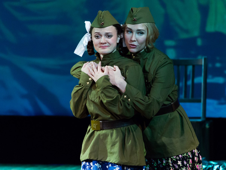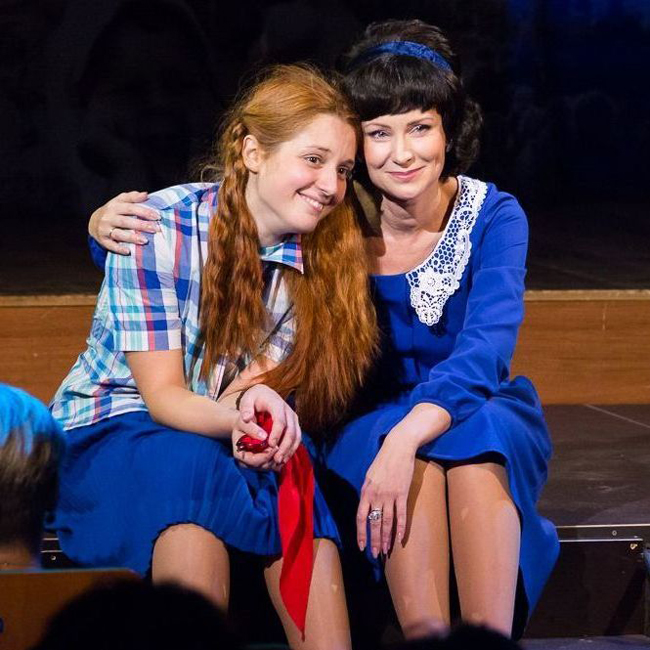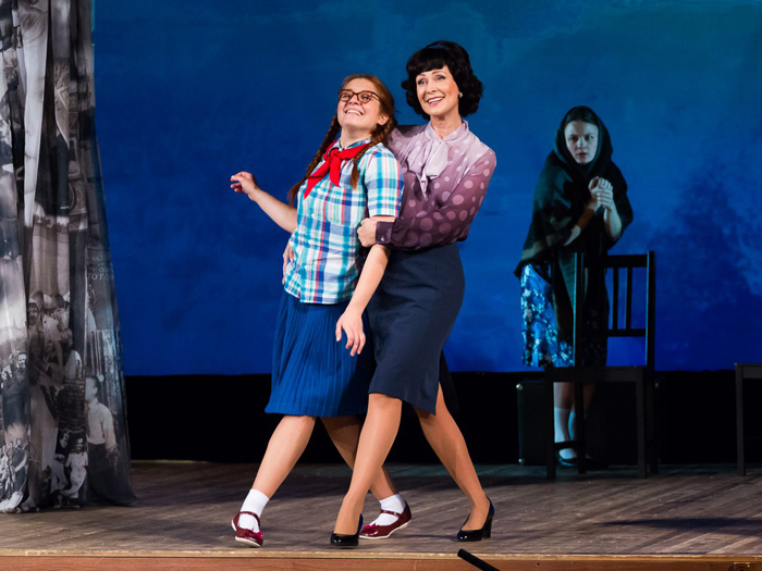 Конечно, стержень постановки – вот этот самый дуэт мамы (художественный руководитель Мос. обл. ТЮЗа Нонна Гришаева) и дочки Лены (молодая актриса Ксения Попович). Вокруг них «вертится» всё и вся. События, надежды и ожидания, поступки Лены и её мамы складываются в историю их жизни и судьбы. А рассказанная взрослеющей Леной в её сочинениях, эта история определяет сценическую игру и все перипетии спектакля. А в этих историях – и перипетии школьной жизни самой Лены; и «приключения» ее во дворе и на улицах в общении с подругами и с мальчишками; и случаи, приключившиеся с мамой на ее работе; и рассказ о фронтовой юности соседки…