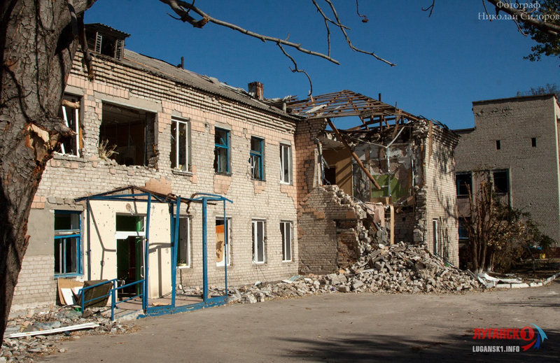 Следующая остановка автобусов была около библиотеки посёлка Новосветловка, полностью разрушенной артиллерией ВСУ. И это было не единственное уничтоженное здание. Кое-какие из них успели подлатать, кое-какие ещё зияли пробоинами, впечатляя руинами.