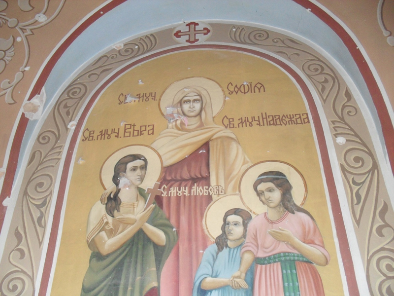 Икона святых Веры, Надежды, Любви и матери их Софии. Изрешечена осколками. Фото автора: ноябрь 2014 года.